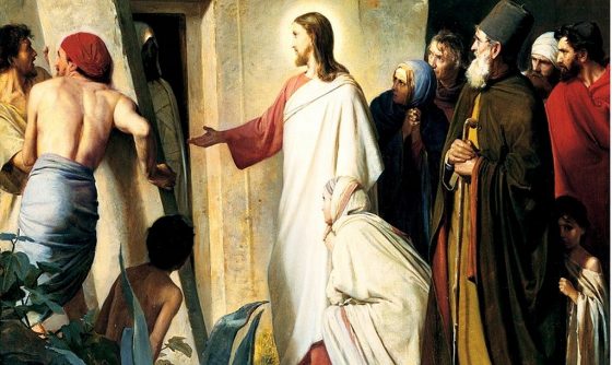 Gdy Maria przyszła do miejsca, gdzie był Jezus, ujrzawszy Go upadła Mu do nóg i rzekła do Niego: «Panie, gdybyś tu był, mój brat by nie umarł». Gdy więc Jezus ujrzał jak płakała ona i Żydzi, którzy razem z nią przyszli, wzruszył się w duchu, rozrzewnił i zapytał: «Gdzieście go położyli?» Odpowiedzieli Mu: «Panie, chodź i zobacz!». Jezus zapłakał. A Żydzi rzekli: «Oto jak go miłował!» Niektórzy z nich powiedzieli: «Czy Ten, który otworzył oczy niewidomemu, nie mógł sprawić, by on nie umarł?» A Jezus ponownie, okazując głębokie wzruszenie, przyszedł do grobu. Była to pieczara, a na niej spoczywał kamień. Jezus rzekł: «Usuńcie kamień!» Siostra zmarłego, Marta, rzekła do Niego: «Panie, już cuchnie. Leży bowiem od czterech dni w grobie». Jezus rzekł do niej: «Czyż nie powiedziałem ci, że jeśli uwierzysz, ujrzysz chwałę Bożą?» Usunięto więc kamień. Jezus wzniósł oczy do góry i rzekł: «Ojcze, dziękuję Ci, żeś mnie wysłuchał. Ja wiedziałem, że mnie zawsze wysłuchujesz. Ale ze względu na otaczający Mnie lud to powiedziałem, aby uwierzyli, żeś Ty Mnie posłał». To powiedziawszy zawołał donośnym głosem: «Łazarzu, wyjdź na zewnątrz!» I wyszedł zmarły, mając nogi i ręce powiązane opaskami, a twarz jego była zawinięta chustą. Rzekł do nich Jezus: «Rozwiążcie go i pozwólcie mu chodzić!». Wielu więc spośród Żydów przybyłych do Marii ujrzawszy to, czego Jezus dokonał, uwierzyło w Niego (J 11, 32-45).