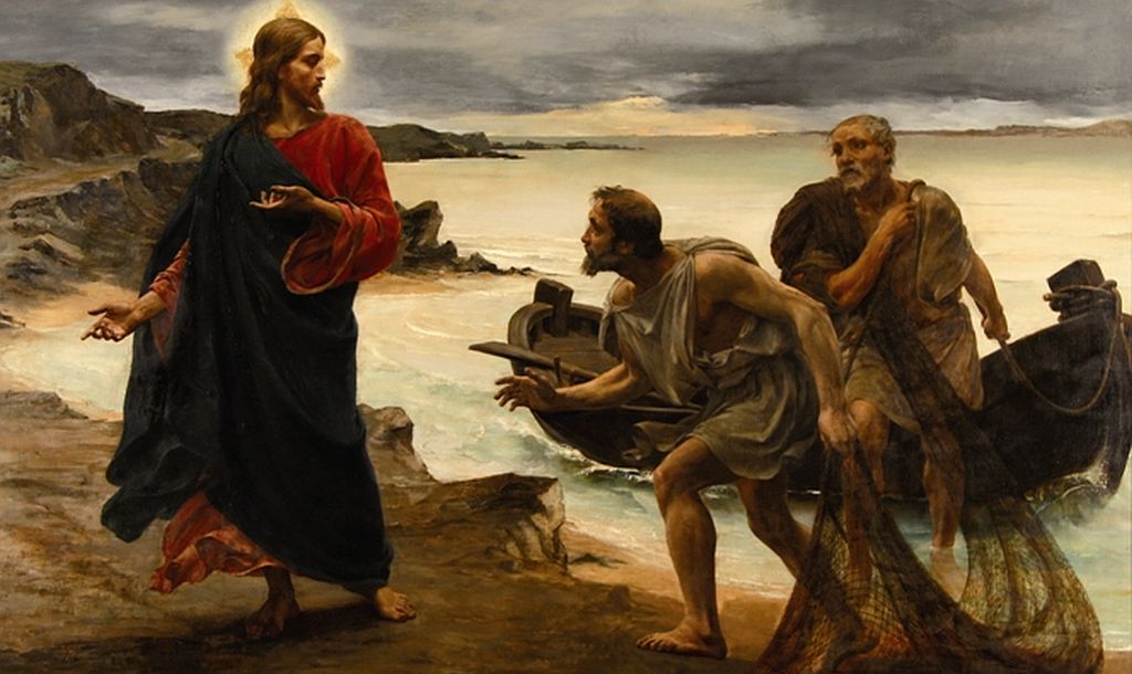 Przechodząc obok Jeziora Galilejskiego, Jezus ujrzał dwóch braci: Szymona, zwanego Piotrem, i brata jego, Andrzeja, jak zarzucali sieć w jezioro; byli bowiem rybakami. I rzekł do nich: «Pójdźcie za Mną, a uczynię was rybakami ludzi». Oni natychmiast, zostawiwszy sieci, poszli za Nim. A idąc stamtąd dalej, ujrzał innych dwóch braci: Jakuba, syna Zebedeusza, i brata jego, Jana, jak z ojcem swym Zebedeuszem naprawiali w łodzi swe sieci. Ich też powołał. A oni natychmiast zostawili łódź i ojca i poszli za Nim. I obchodził Jezus całą Galileę, nauczając w tamtejszych synagogach, głosząc Ewangelię o królestwie i lecząc wszelkie choroby i wszelkie słabości wśród ludu (Mt 4, 12-17).