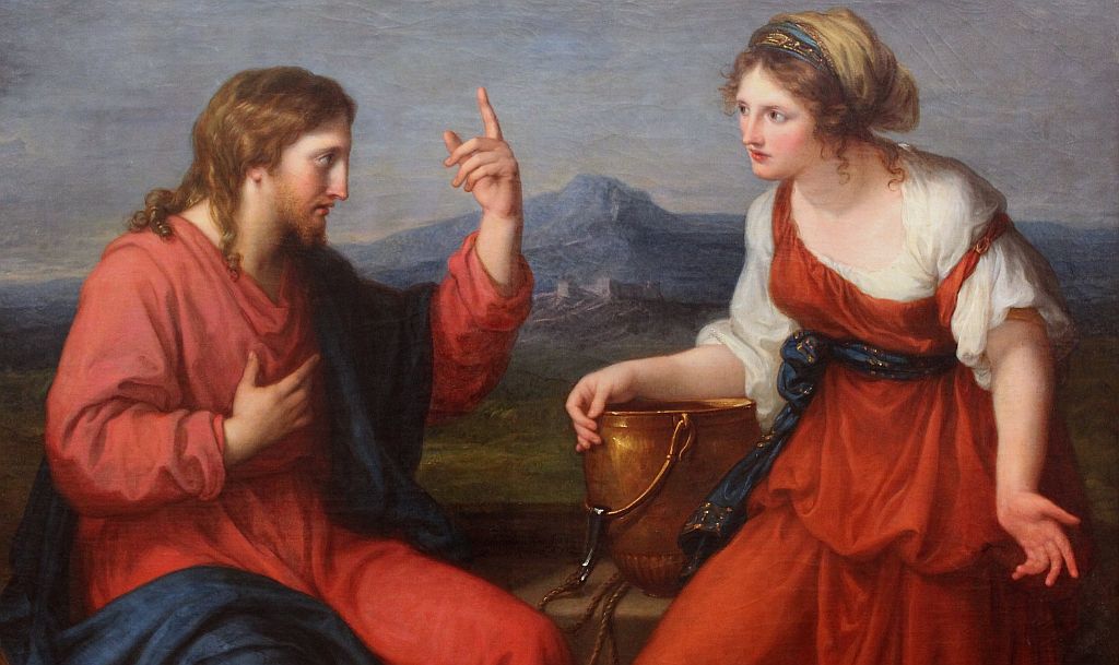 Jezus przybył do miejscowości samarytańskiej, zwanej Sychar, położonej niedaleko posiadłości, którą przekazał Jakub swemu Synowi Józefowi. Tam znajdowała się studnia Jakuba. Jezus, zmęczony przebytą drogą, usiadł obok studni, a było to około godziny szóstej. Nadeszła wtedy kobieta – Samarytanka, aby zaczerpnąć wody. Jezus poprosił ją: „Daj mi się napić”. Jego uczniowie natomiast poszli do miejscowości, aby kupić coś do jedzenia. Kobieta odparła jednak: „Jakże Ty, Żyd, możesz prosić mnie, kobietę samarytańską, o wodę?” Żydzi bowiem nie utrzymywali kontaktu z Samarytanami. Na jej słowa Jezus odpowiedział: „Gdybyś znała dar Boży, a także wiedziała, kim jest Ten, kto ci rzekł: ‘Daj mi się napić”, to byś Go poprosiła, a On dałby ci wody żywej”. Kobieta zawołała wtedy: „Panie, przecież Ty nie masz nawet czerpaka, a studnia jest głęboka. Skąd więc weźmiesz wodę żywą? Czyżbyś był większy od naszego ojca Jakuba, który dał nam tę studnię? Zresztą on sam z niej korzystał, jego synowie i trzody”. Wówczas Jezus oznajmił jej: „Każdy, kto pije tę wodę, nadal będzie odczuwał pragnienie. Kto natomiast napije się wody, którą Ja mu dam, już nigdy więcej nie będzie odczuwał pragnienia, gdyż woda, którą mu dam, stanie się w nim obfitym źródłem na życie wieczne”. Kobieta poprosiła więc: „Panie, daj mi takiej wody, abym już więcej nie odczuwała pragnienia i nie musiała przychodzić tutaj i czerpać”. Jezus więc polecił jej: „Idź, zawołaj swojego męża i przyjdźcie tutaj”. Ona zaś odparła: „Nie mam męża”. Na co Jezus rzekł: „Słusznie powiedziałaś: ‘Nie mam męża”. Miałaś ich bowiem pięciu, a i ten, którego masz, nie jest twoim mężem. To powiedziałaś prawdziwie”. Wtedy kobieta zawołała: „Panie, widzę, że Ty jesteś prorokiem! Nasi przodkowie oddawali cześć Bogu na tej górze; wy zaś twierdzicie, że jedyne miejsce, gdzie należy Go czcić, znajduje się w Jerozolimie”. Jezus jej odrzekł: „Wierz mi, kobieto. Oto nadchodzi czas, że ani na tej górze, ani też w Jerozolimie nie będzie się już wielbiło Ojca. Wy czcicie to, czego nie znacie; my zaś oddajemy cześć Temu, kogo znamy. Zbawienie bowiem pochodzi od Żydów. Nadchodzi jednak godzina, a właściwie już jest, kiedy prawdziwi czciciele będą wielbili Ojca w Duchu i w prawdzie. Zresztą takich czcicieli pragnie sam Ojciec. Bóg jest duchem, stąd też ci, którzy Go wielbią, winni to czynić w Duchu i w prawdzie”. Wtedy kobieta odparła: „Wiem, że ma nadejść Mesjasz, czyli Chrystus. I gdy tylko On przybędzie, wszystko nam wyjaśni”. Jezus oznajmił jej wówczas: „To Ja nim jestem, Ja, który mówię z tobą”. W tym czasie wrócili uczniowie i zdziwili się, że rozmawiał z kobietą. Nikt z nich jednak nie zapytał: „Czego od niej chcesz?” lub „O czym z nią rozmawiasz?” Kobieta zaś zostawiła naczynie do czerpania, wróciła do swojej miejscowości i zaczęła namawiać mieszkańców: „Chodźcie zobaczyć kogoś, kto wyjawił mi wszystko, co uczyniłam. Czyż nie jest On Chrystusem?” Ci więc wyszli z miasta i przybyli do Jezusa. Uczniowie tymczasem zachęcali Go: „Rabbi, jedz!”. Wtedy Jezus oświadczył im: „Ja mam pokarm do spożycia, którego wy nie znacie”. Pytali się więc nawzajem: „Czyżby ktoś przyniósł Mu coś do jedzenia?”. Jezus odpowiedział im: „Moim pokarmem jest wypełnienie woli Tego, który Mnie posłał, oraz wykonanie wyznaczonego Mi dzieła. Czyż nie twierdzicie: ‘Jeszcze cztery miesiące i nadejdzie czas żniw?’. Ja natomiast wam mówię: Podnieście tylko wzrok i popatrzcie na pola – już dojrzały do żniwa. Żniwiarz otrzymuje zapłatę i gromadzi owoce pracy na życie wieczne. W ten sposób siewca cieszy się razem ze żniwiarzem. Tak oto okazuje się prawdziwe powiedzenie: „Jeden sieje, a drugi zbiera”. Ja posłałem was, abyście zbierali plony, chociaż nie trudziliście się nad nimi wcześniej. Inni pracowali w znoju, a wy korzystaliście z ich wysiłku”. Wielu Samarytan z tej miejscowości uwierzyło w Niego na podstawie świadectwa danego przez ową kobietę: „Wyjawił mi wszystko, co uczyniłam”. Przyszli więc do Niego z prośbą, aby pozostał u nich. I przebywał tam dwa dni. Wtedy jeszcze więcej uwierzyło dzięki głoszonej przez Niego nauce. Do tej kobiety zaś mówiono: „Teraz wierzymy już nie na podstawie tego, co nam powiedziałaś, lecz dlatego, że sami Go usłyszeliśmy. Wiemy, że On naprawdę jest Zbawicielem świata (J 4, 5-42).
